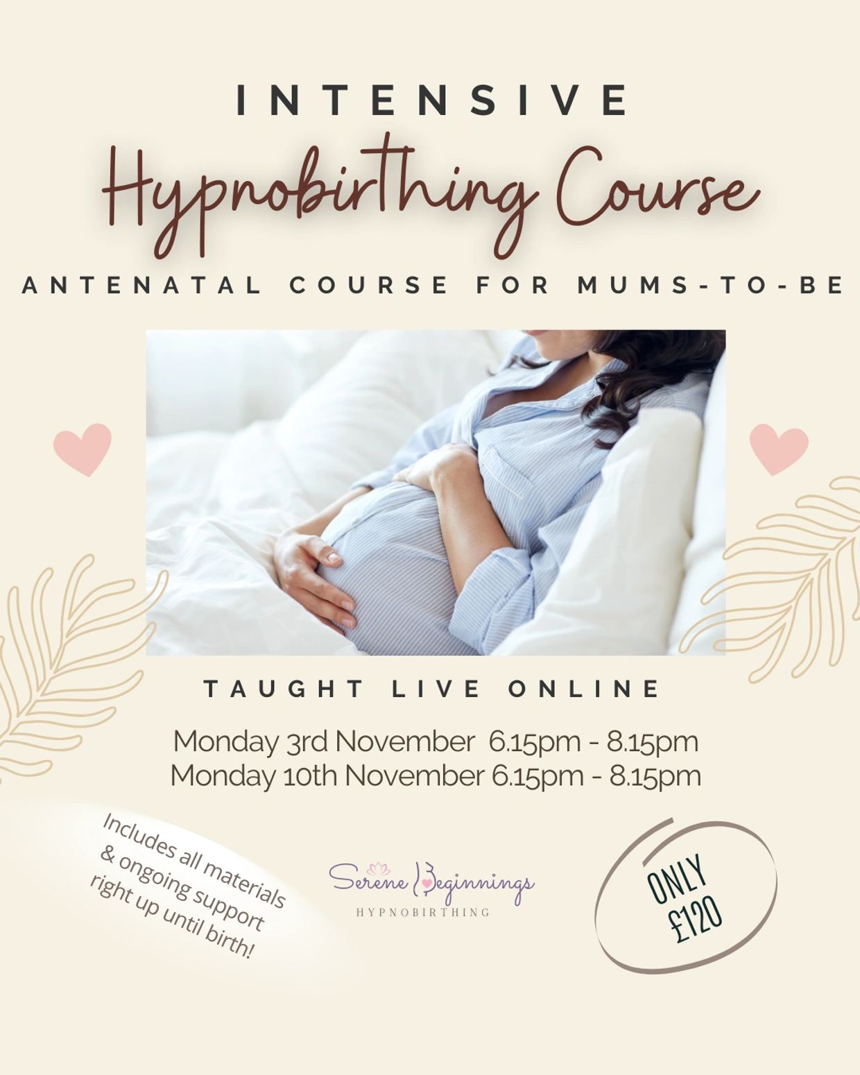 Join us for a 2 week intensive online group Hypnobirthing programme enables you to transform your mindset and release your fears around birth, all from the comfort of your own home! You'll learn how to work WITH your body during labour and how to avoid the most common pitfalls that can lead to a more difficult birth. You'll be equipped with tools and techniques to help you stay calm and in control, and to reduce pain naturally during labour. Classes are taught live online via Zoom on Monday evenings 6.15pm-8.15pm for 2 weeks starting Monday 3rd November.